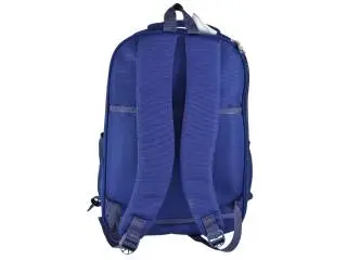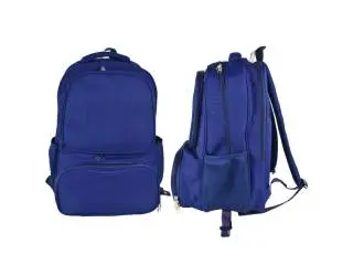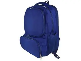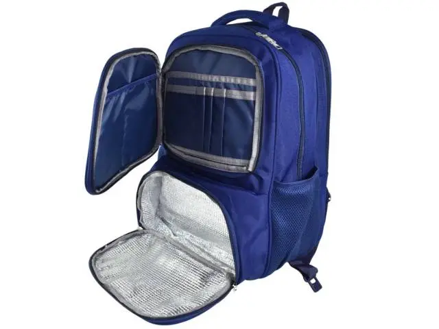 Mochila azul con compartimientos.